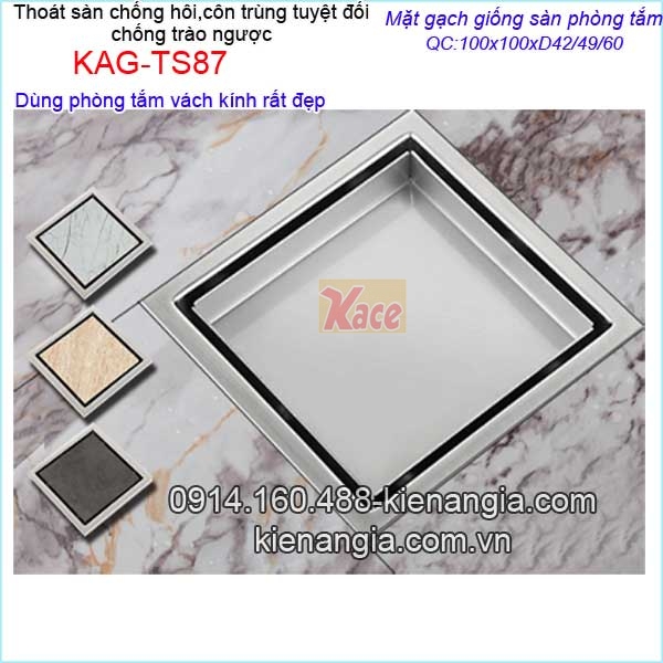 Thoát sàn mặt cắt gạch 100x100xD424960 KAG-TS87,phễu thoát sàn phòng tắm chống hôi TUYỆT ĐỐI ,chống trào ngược,chống côn trùng tuyệt đối rất đẹp,giá tốt KIẾN AN GIA-0914.160.488 dùng cho ống D42,D49,D60.Bạn có thể chọ qui cách phễu thoát sàn 100x100 (TS87),120X120(TS88),150X150(TS89).XEM CLIP SẢN PHẨM THẬT TẠI ĐÂY hoặc ĐÂY