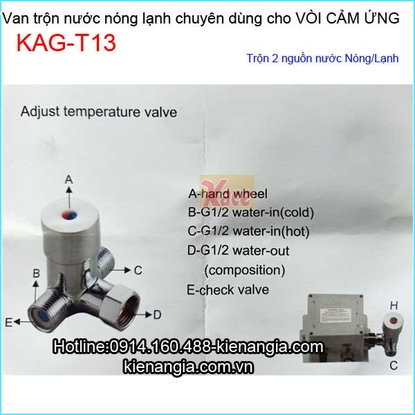 Van trộn nước nóng lạnh KAG-T13 ,bộ trộn nước Nóng lạnh hoạt động trên nguyên tắc trộn 2 nguồn cấp nước nóng và lạnh thành nước dùng cho vòi cảm ứng tạo ra nguồn nước nóng thuận tiện sử dụng cho lavabo gia đình,resort,khách sạn,trạm dừng chân,TTTM,giá tốt KIẾN AN GIA